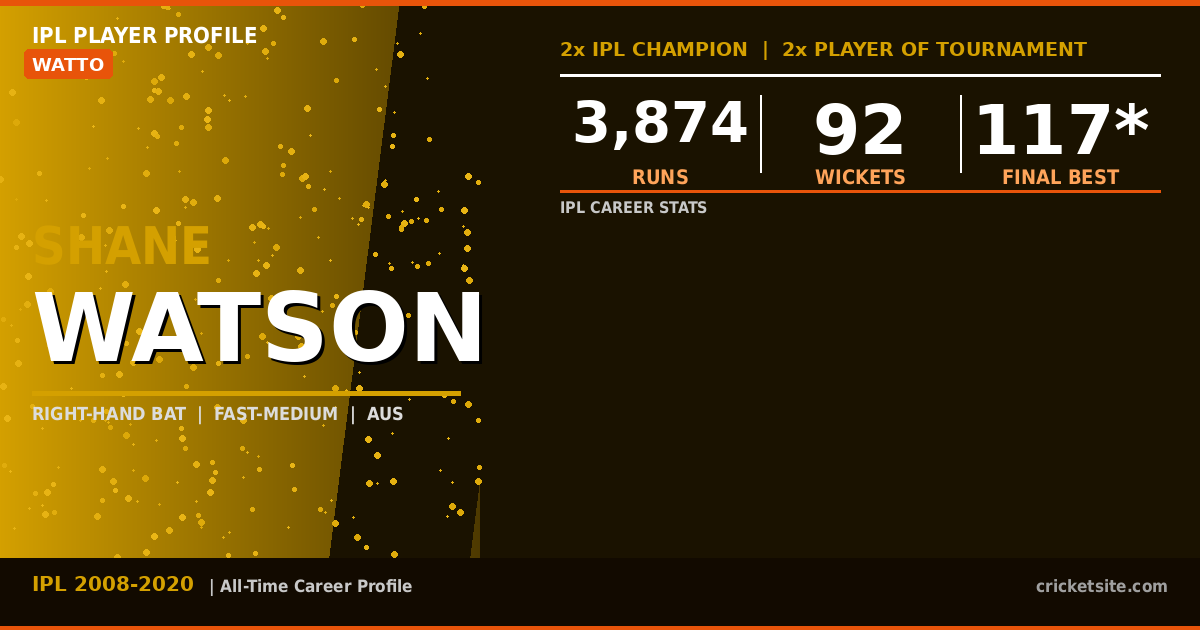 The original IPL all-rounder. Watson won IPL titles a decade apart — with Rajasthan in 2008 and CSK in 2018. He was named Player of the Tournament in the inaugural season, then repeated the feat in 2013. His 117* in the 2018 final, scored on a battered, bleeding knee, remains one of the great individual performances in IPL history.